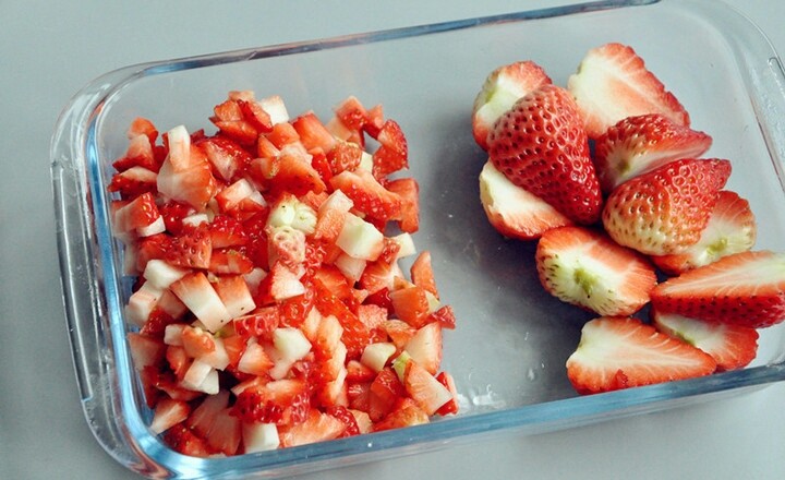 13. 准备新鲜草莓,大块用于装饰,小块用于夹层