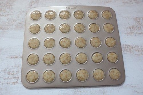 8. 裱花袋剪一个小口,均匀的将面糊挤在不沾烤盘上。