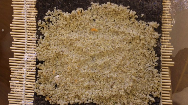 5. 把选择的碳水化合物放上,最好粘粘的,用力气把它压上,只放到3/4海苔上:我用了藜麦