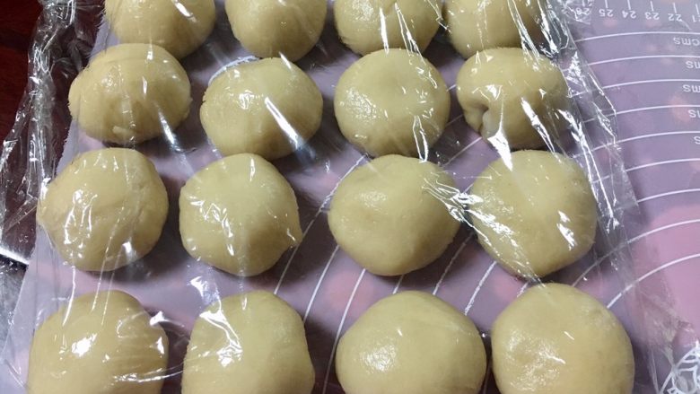 6. 油皮,油酥都平分成十六份,保鲜膜盖好。