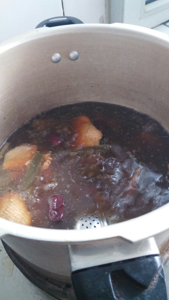 10. 把煸香的鸭肉到入高压锅内,加葱姜、小枣。