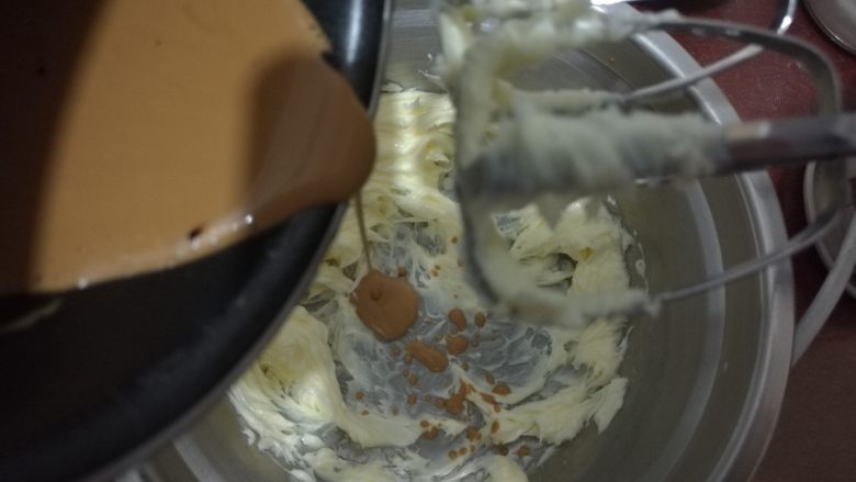 16. 黄油室温软化稍微打发。温热的淡奶油分次加入到黄油中打蛋器高速打发。每一次搅打均匀后再加入下一次。