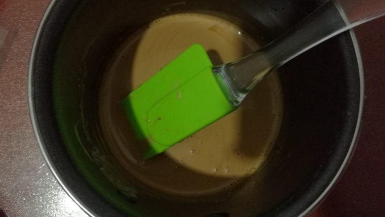 6. 打发好的蛋白霜分三次加入到上一步中。第一次压拌,消泡也没关系。第二次戚风一样翻拌,第三次飘带拌,捞起,抖落。