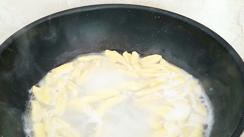 8. 锅中注水烧开,放入剪刀面煮透过凉水备用。
