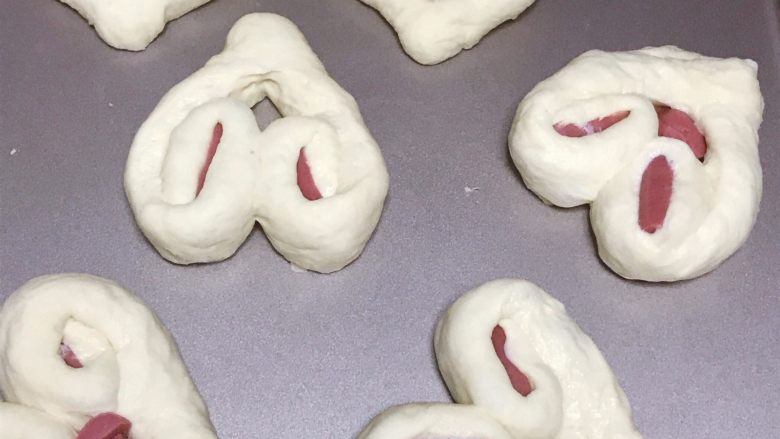 9. 整形成心形的样子,底部空的可以再放一些热狗肠。放在温度38,湿度75%的环境中进行最后发酵
