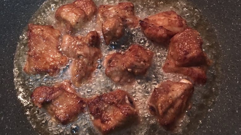 10. 直接放入煎炸完馬玲薯的鍋中用小火慢煎炸小排,同樣的是先定型再翻面,