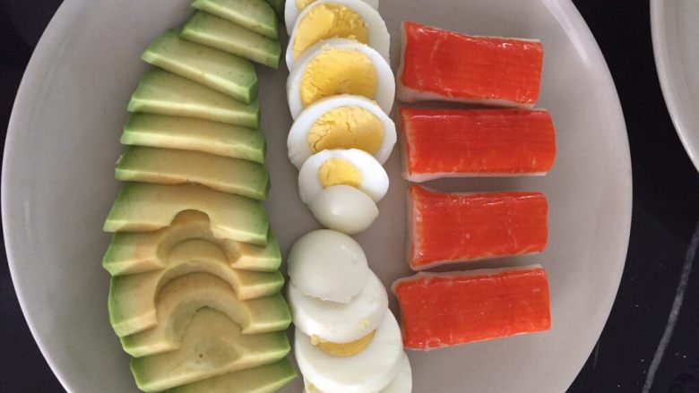 1. 首先准备好材料,牛油果切片,鸡蛋煮熟切片,蟹柳是用日本进口的,大大的一条、可以生吃的,如果是国产的还是建议用开水煮一下。