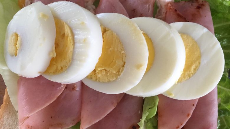 三明治里的爱马仕--厚吐司,      再铺上火腿片,鸡蛋,可以撒点盐或者黑椒粉,又或者番茄酱。个人喜欢,如果番茄酱会好一点,因为出来色彩就鲜艳点。