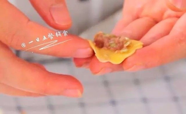 11. 取一张蛋皮,挖一点牛肉馅在蛋皮上,对折一下,利用肉馅的粘性粘合起来。厚的蛋皮是粘不起来的。
