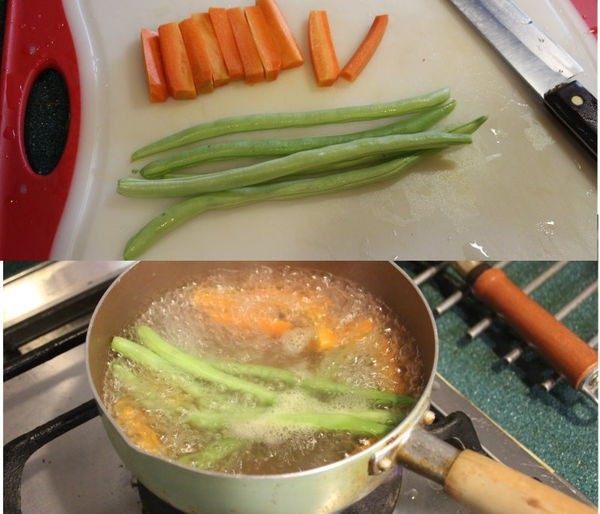 2. 牛肉片2-3片交迭摆好,放上红萝卜、四季豆、烫过挤去水分的菠菜,卷起后,末端收口处涂上一些太白粉。