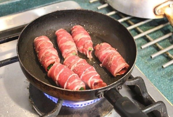 3. 平底锅加油烧热后,将牛肉卷最后接合面先朝下油煎