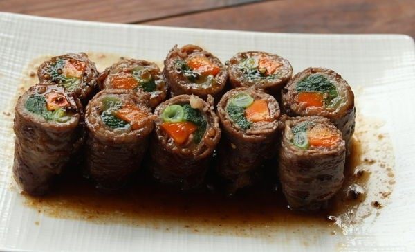 6. 煮好中间横切摆盘,淋上剩余的煮汁。 简单又好吃,牛肉片可以用猪肉片取代。山药或事先卤煮过的牛蒡也很适合入卷。