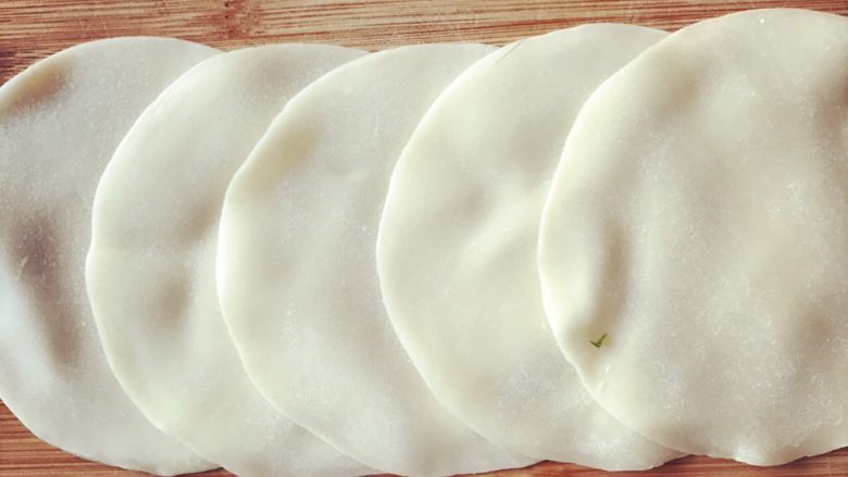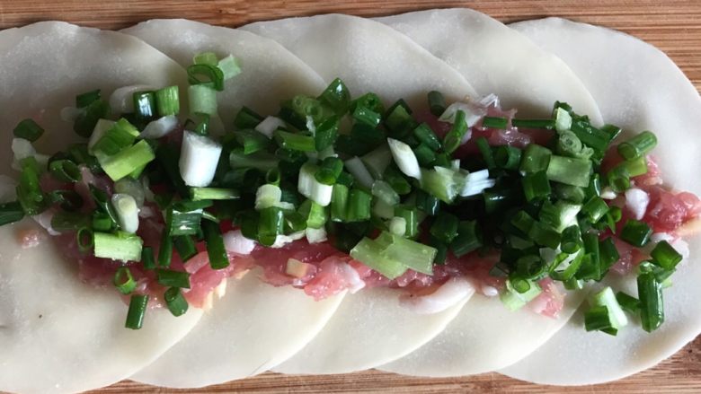 6. 卷起来,使肉馅儿和葱包在饺子皮中。