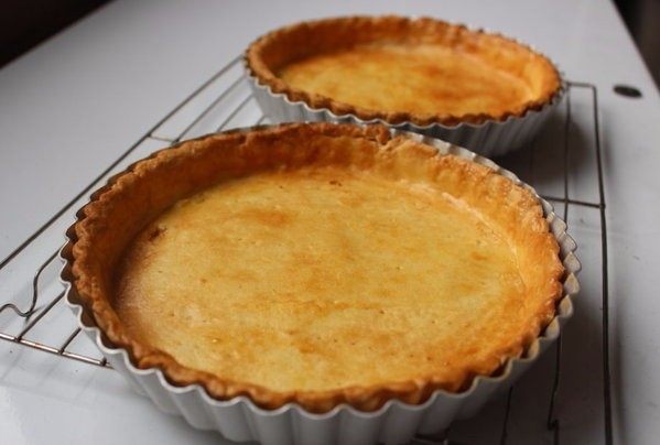 17. 烤箱预热至 180°c,将派放入空烤 20-25 分钟,将派皮取出,拿掉上面的纸和压盘物,刷上蛋液再进烤箱续烤 5分钟至派底呈金黄色泽。