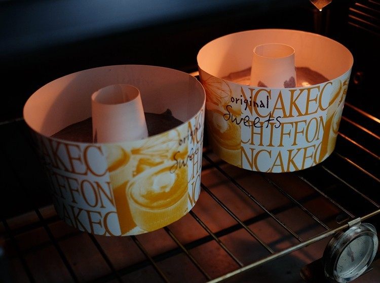 - 1.烤好的戚风蛋糕拿出来立即倒扣,防止回缩