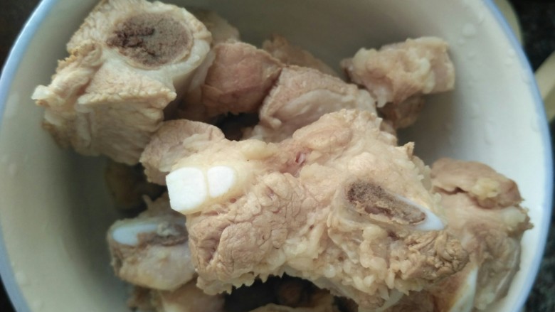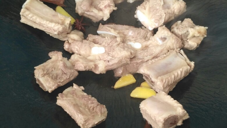 4. 锅中留底油放入八角 桂皮 姜爆香下排骨一起煸香