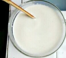 5. 将山芋粉放进容器中,缓缓倒入热开水,温度一定要高,边加水边搅拌,只要水温够高,山芋粉肯定会成半透明状,尽量的搅拌均匀。