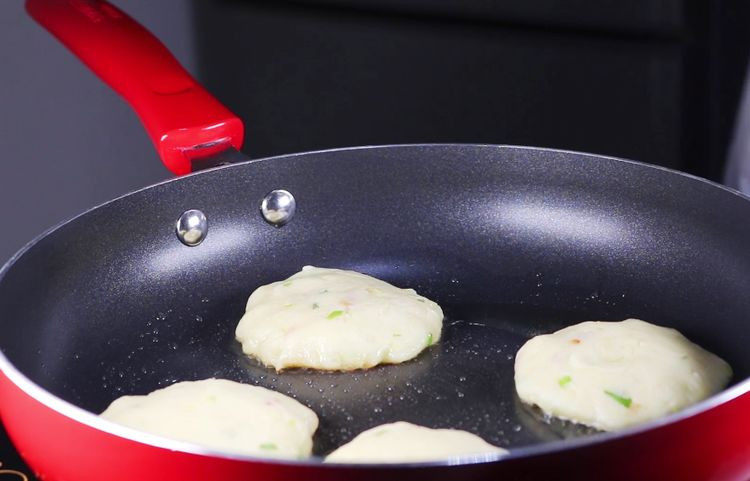 12. 锅烧热,倒入多一些的植物油,将土豆饼下锅煎。