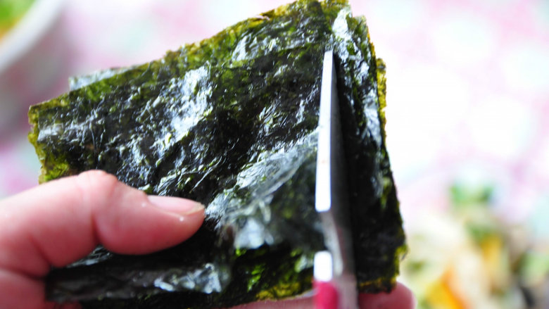 4. 将紫菜切成合适的条状大小,剩下的就捏成碎碎加进饭里