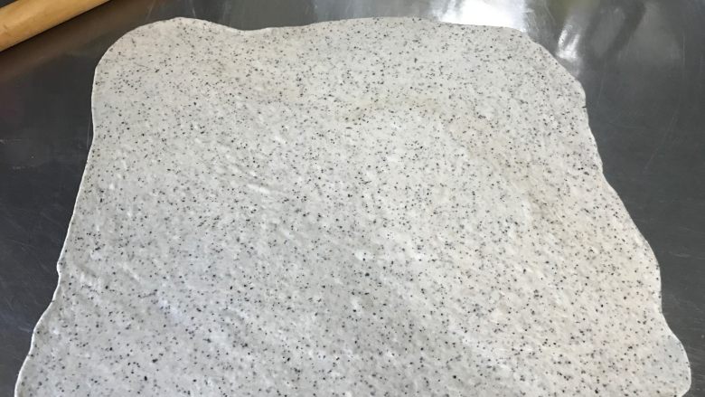12. 面团放在案板上后,用涂抹了油的擀面杖擀开,擀长呈长方形,厚度2.3毫米左右