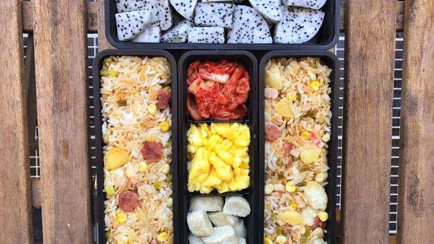 22. 再把鱼圆切块放进盒里 鸡蛋装进去 再加上一点泡菜 切好水果装好 最后再装入焖饭