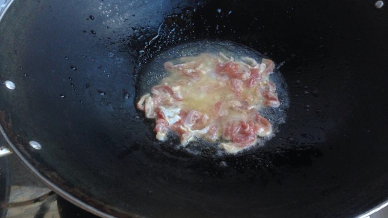 7. 热锅下油,加肉丝,翻炒。