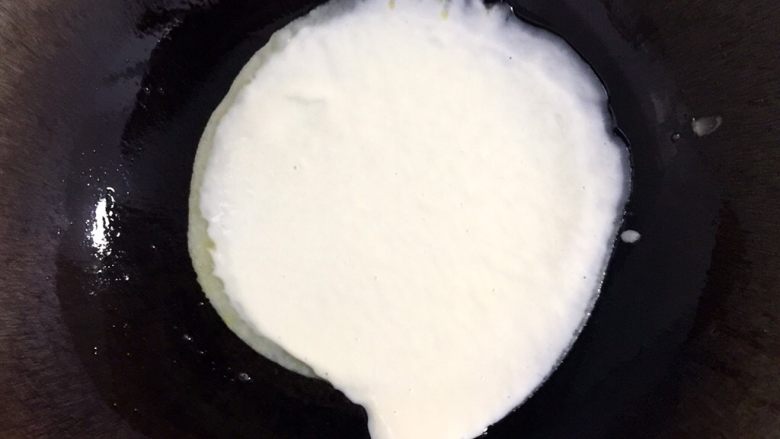 5. 热锅,倒入一点点油加热,舀一勺面糊放入锅中,快速转动锅,面糊平摊在锅中。