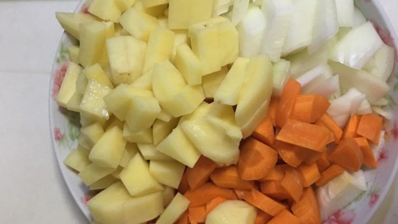 6. 锅中放入平底油 将胡萝卜丁 土豆丁 洋葱丁 翻炒 炒出香味