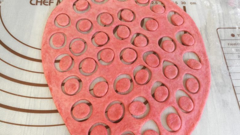 12. 12.粉色面团擀平,用裱花嘴按成圆形