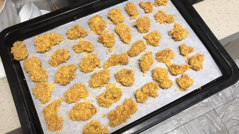 4. 烤盘垫烤纸,把鸡米花摆放好
