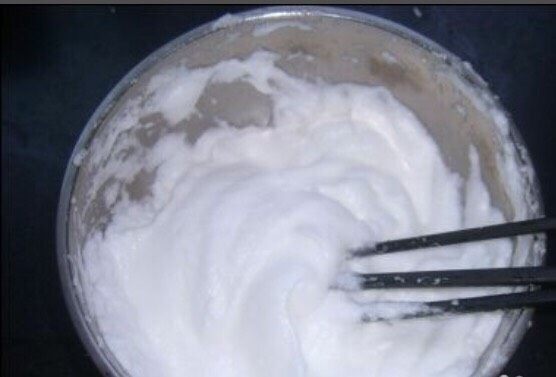 7. 当蛋清打到这个程度,再加入一勺白糖(如果不喜欢吃太甜可以少放一些),继续打,很辛苦的,但是打蛋清是蛋糕最后发起来的重要因素,所以很关键,