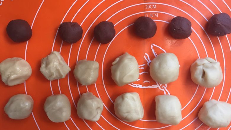2. 把油皮、油酥和红豆沙分别分割成六个等份的剂子搓圆备用