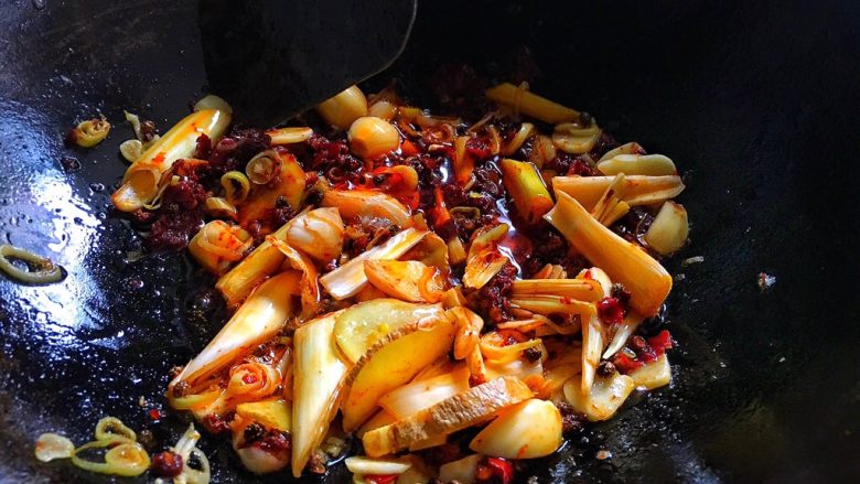 11. 留一点油放入豆瓣酱 葱姜蒜 麻椒翻炒几下