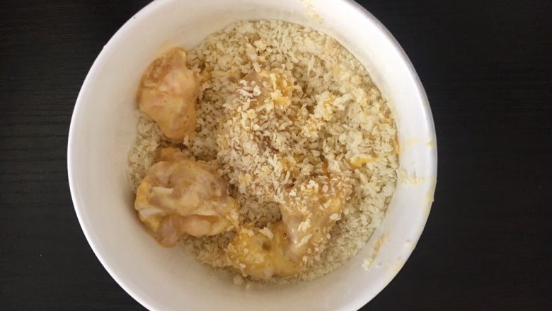 8. 鸡蛋液裹好之后,放入面包糠里,均匀地裹上一层,最好团一下,防止油炸时脱落。