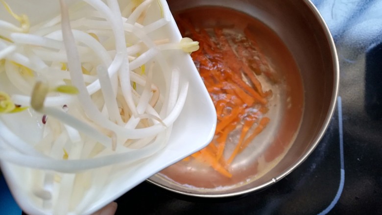 3. 胡萝卜焯3分钟后下绿豆芽 焯水2分钟