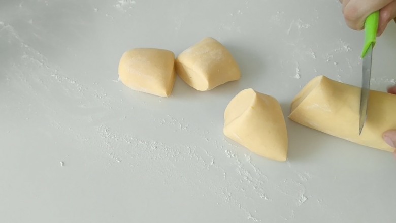 6. 剩余少量黄色面团,其他的充分揉捏排气,至切开,面团无气孔,既排气完毕。