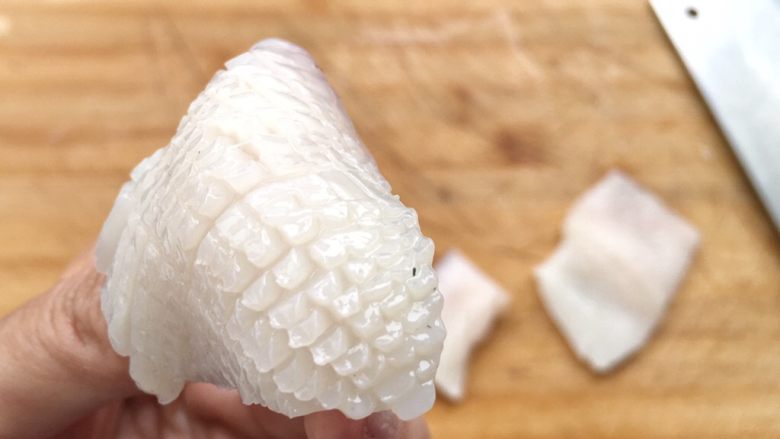 4. 然后就是切,这里比较重要: 1.想要得到好看的鱿鱼卷必须从鱼的内侧切,从外侧切就不会看到美美的花纹, 2.切鱿鱼时用刀倾斜45度左右轻轻划过鱿鱼,斜着切就会得到麦穗花纹,直切就是小方格子,不要切断了,手法类似切腰花, 手法1如图