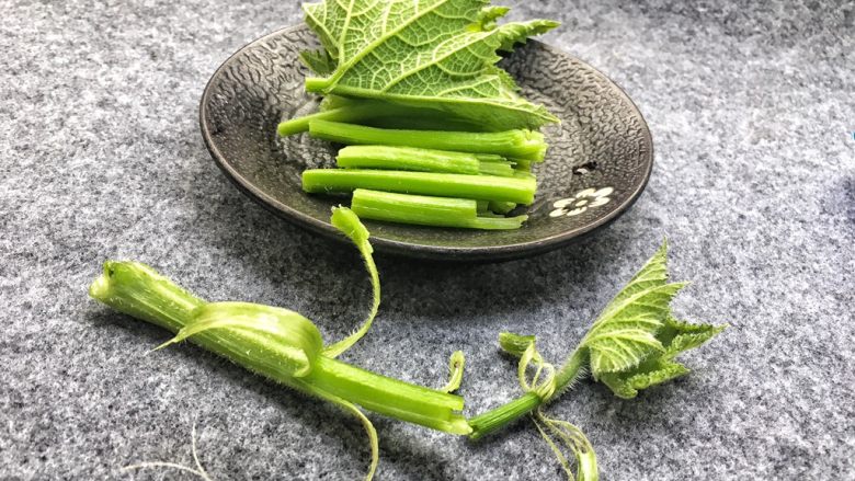 2. 下面教大家一个处理南瓜尖的方法;为什么有的朋友说自己炒的南瓜尖老又嚼不动?当然是你的处理方法不对啦!南瓜尖需要把外皮轻轻地剥掉,留下来的就是嫩的部分。如图,轻轻去皮。