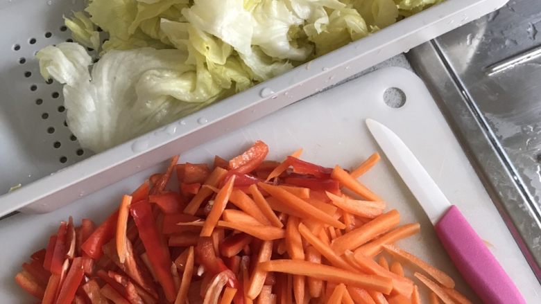6. 待大白菜有些瘪了出水了再混入胡萝卜和红椒丝