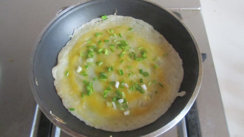 9. 翻个面,继续煎至,将鸡蛋刷满饼底;