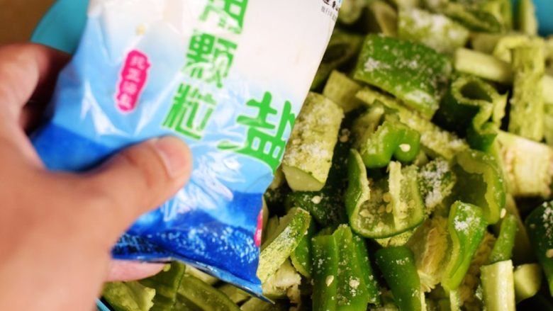 2. 将黄瓜和辣椒条置入一容器中,撒上半斤盐拌匀;