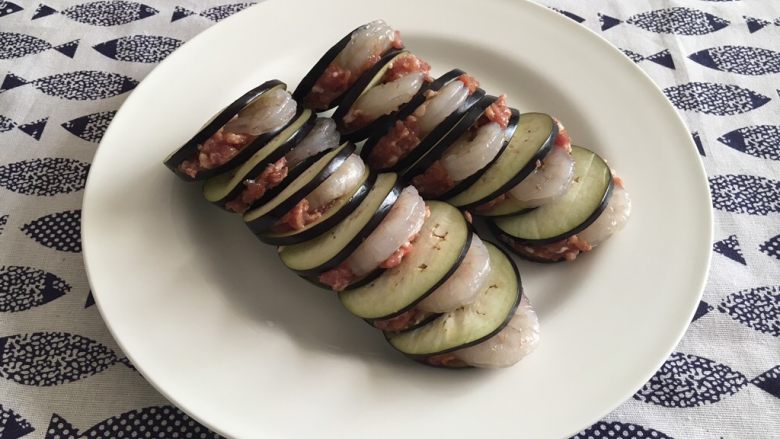 6. 放入1个虾仁,轻轻将茄盒合拢。