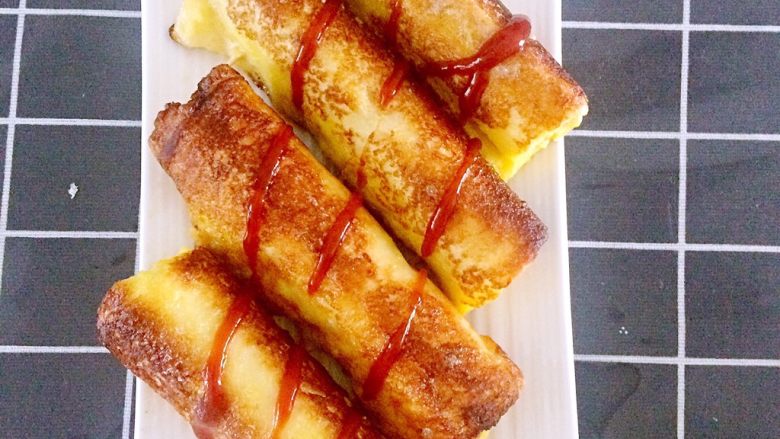 - 面包片一定要擀薄,要不卷不起香肠。火候一定要小火慢煎。我着急上班,所以火大了。我女儿是特别喜欢吃。配点青菜水果。各种营养都满足了。