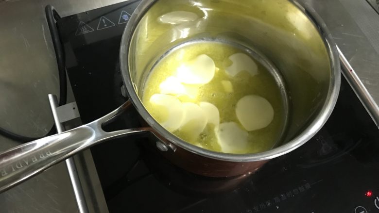 3. 无盐黄油放小锅中加热融化,煮沸后马上离火