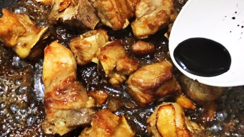 5. 排骨变焦黄后,加入冰糖继续翻炒