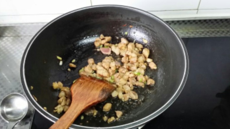 6. 倒入肉丁翻炒变色盛出。
