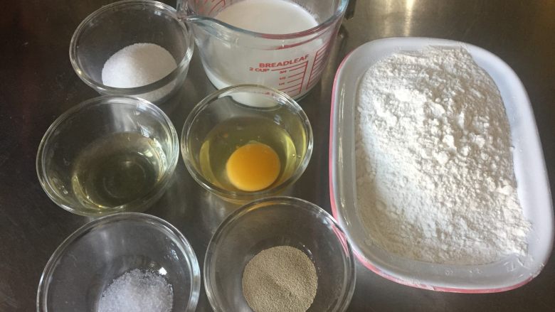 2. 面团的所有材料放入面包桶中,揉面两个程序约40分钟至面团均匀可以拉出筋膜 准备第一次发酵