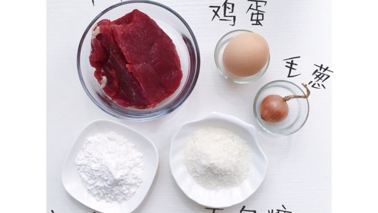 5. 牛肉糜加入毛葱 淀粉抓匀顺时针方向搅拌上劲儿