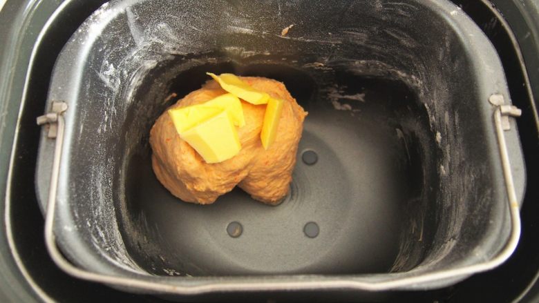 2. 将面粉放入面包机桶中,在角落里放入酵母。加入胡萝卜泥,将糖和盐融化于牛奶中加入,开启揉面程序揉成光滑面团。