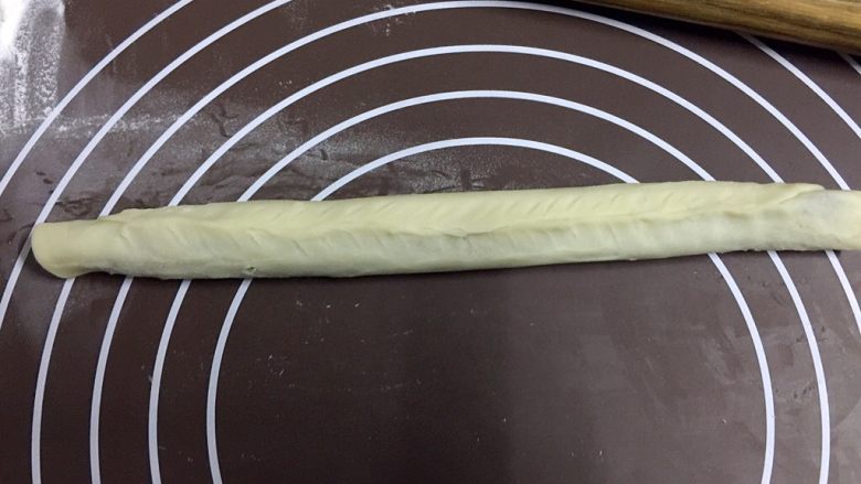 13. 取一个面团搓成15cm左右的长条 剩余小面团放回揉面盆内,盖上盖子或布 以免表面风干